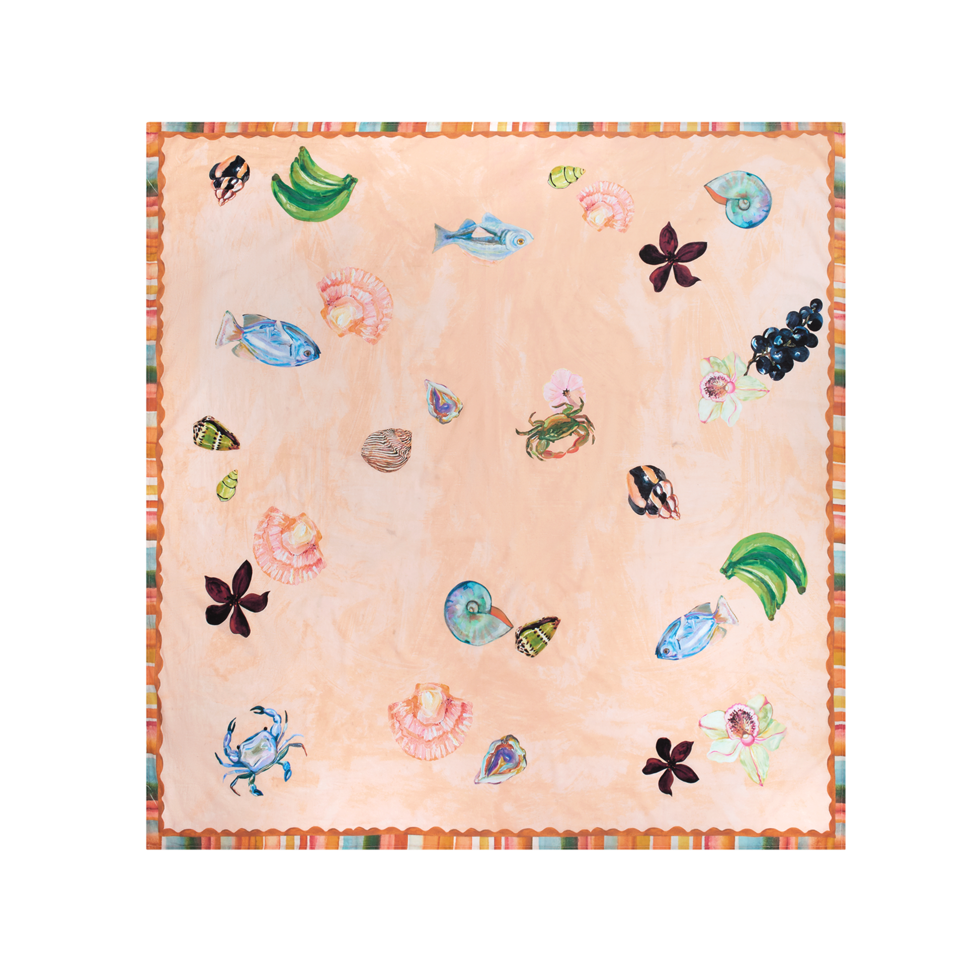Our Pastel Sea Sarong is part of our Artist Series, featuring Annie Everingham’s hand-painted artwork. Painterly pastels and expressive brushstrokes capture the quiet magic of the seaside, shells, fruits, fish, and tropical orchid motifs layered over a soft peach-wash background. A colourful watercolour stripe border frames the artwork, digitally printed on a semi-sheer, lightweight cotton voile.